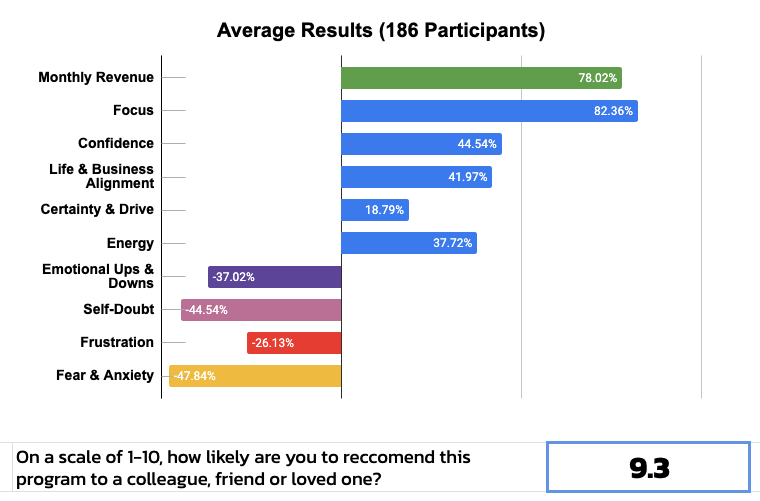 During the study, we focused solely on removing mental blocks, fears, doubts & frustrations using our charge clearing system. We did not focus on any "business tactics or strategies".